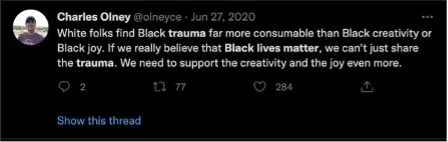 Olney, Charles (@olneyce). “White folks find Black trauma far more consumable than Black creativity or Black joy. If we really believe that Black lives matter, we can’t just share the trauma. We need to support the creativity and the joy even more.” 27 June 2020, Tweet.