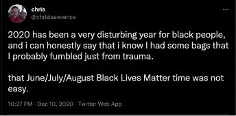 Lawrence, Chris (@chrislaawrence). “2020 has been a very disturbing year for black people, and I can honestly say that I know I had some bags that I probably fumbled just from trauma. That June/July/August Black Lives Matter was not easy.” 10 Dec. 2020, Tweet.