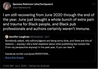 Robinson, Quressa (@qnrisawesome). “I am still recovering from June 2020 through the end of the year. June just brought a whole bunch of extra pain and trauma for Black people, and Black pub professionals and authors certainly weren’t immune.” 1 July 2021, Tweet.