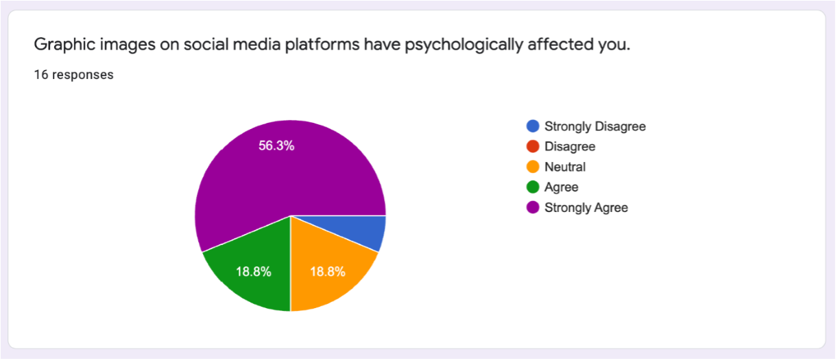 Quantitatively, I was then able to make conclusions based upon the psychological responses and race. I started by generally asking if graphic images are psychologically impactful, to which 75.1% of the respondents said they both agree and strongly agree with the statement, leaving just above 6% to strongly disagree (Fig. 2). The next aspect of the survey drew on race correlation, as 75% of people that voted towards graphic images being mentally stressful were Black and/or African American as seen in Figure 3 below.