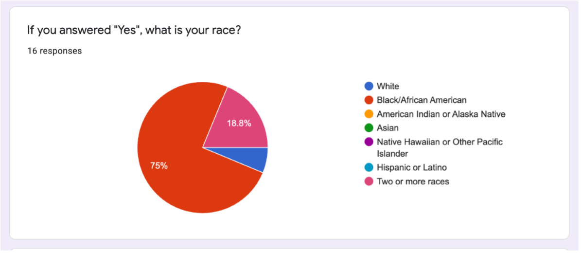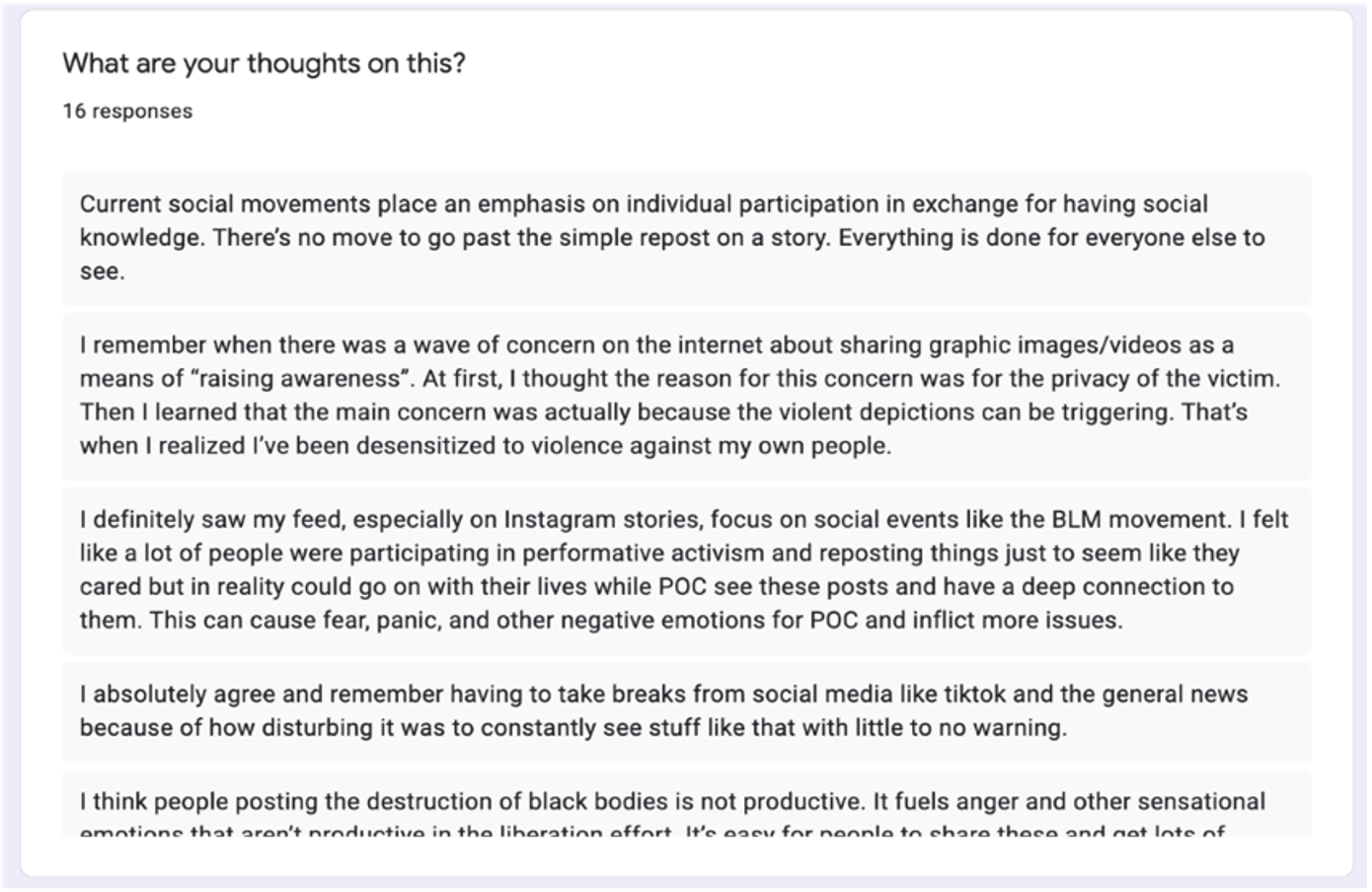 Beyond the Twitter world, the psychological effects imposed upon Black minds as a result of “misguided activism” trickle down to the very smallest interactions within the Black community. I conducted a survey attempting to understand diverse responses toward a rather overlooked social issue within the Black community, yet my findings revealed that Black experiences are strikingly similar. A total of 16 anonymous individuals were respondents to this informal and universally open survey that had an array of open-ended questions. In addition, I gathered quantitative data on the correlation between trauma response and race. I asked two open questions, both allowing the respondent to share personal thoughts and feelings on the issue (as shown in Figure 1).