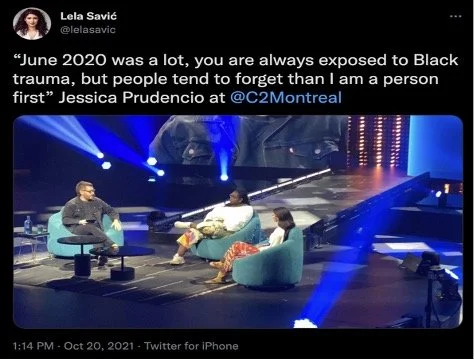 Savic, Lela (@lelasavic). “June 2020 was a lot, you are always exposed to Black trauma, but people tend to forget that I am a person first.” Jessica Prudencio at @C2Montreal.” 20 Oct. 2021, Tweet.