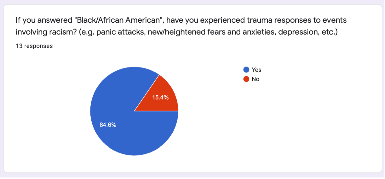 Most significantly, 84.6% of Black and/or African American respondents indicated that they do, in fact, experience trauma responses to racist events while a minority of 15.4% said they have not (Fig. 4).